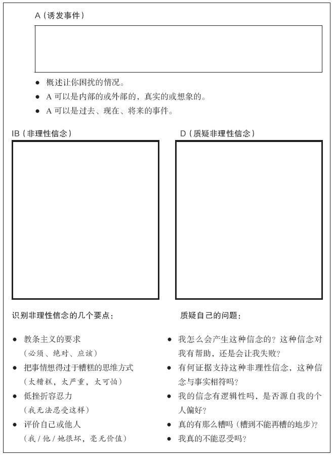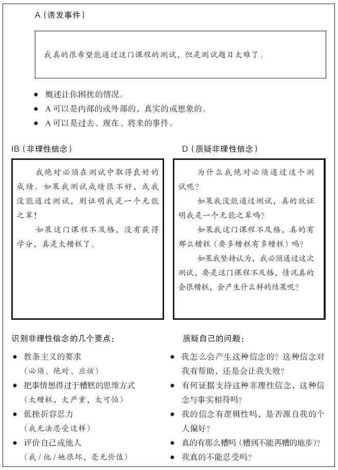 图5-1列出了一些你可以做的思维练习。你先要找出干扰事件和后果,即不健康的消极情绪和自我挫败行为。然后,你问问自己是哪些诱发事件或不愉快事件导致了这些结果。然后,列出你的非理性信念(IB),并对其辩论(D),这样,你就会得出E,即通过辩论非理性信念而产生的新信念以及有益的情绪和行为。